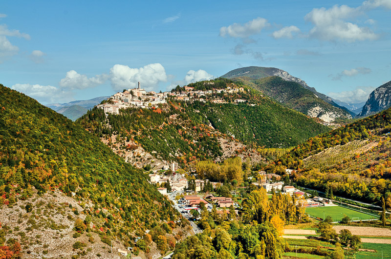 In basso scorre il Fiume Nera, l’antico Nahar, affiancato dalle forme geometriche dei prati e dei campi di fondovalle e nascosto dallo stretto bosco fluviale di salici, pioppi e ontani. In alto si erge il castello di poggio di Cerreto di Spoleto sorto a dominio delle strette valli del Vigi e del Nera, importante snodo per tutto il Centro Italia Gli eleganti palazzi gentilizi testimoniano la sua storia di ricchezza e potere cosi come gli insediamenti sparsi nel suo territorio fanno da indispensabile cornice a questa storia.