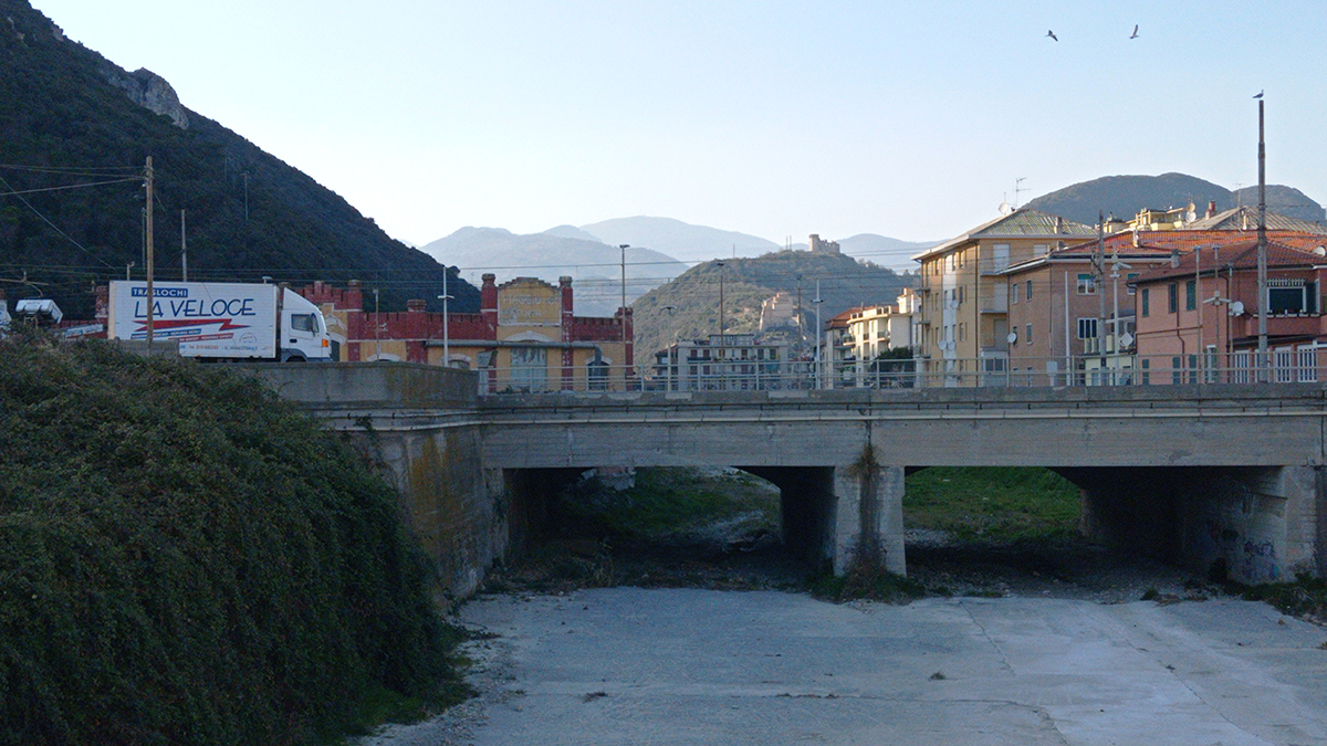 È evidente la compresenza di elementi naturali ed antropici. Tra gli elementi predominanti c’è il letto artificiale del torrente Pora che separa l’area urbana dall’ex zona industriale, oggi fortemente degradata. Il fiume è sormontato dai ponti della ferrovia e della strada statale. In secondo piano l’Altopiano Finalese, in particolare Monte Caprazoppa, zona prevalentemente boschiva ma dove è evidente l’intervento dell’uomo nella costruzione di strutture architettoniche indipendenti tutt’oggi visibili.