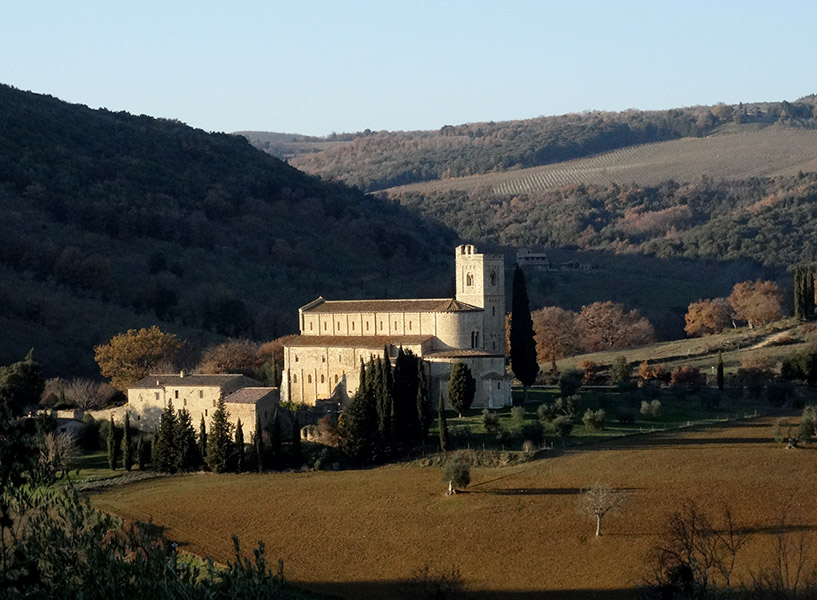 Trae le origini da un oratorio del IV sec. edificato nel luogo del martirio di Sant’Antimo di Arezzo. La prima costruzione fu un monastero benedettino del 770, su cui Carlo Magno appose il suo sigillo. Nel XII sec. fu costruita l’abbazia attuale su modello di quella benedettina di Cluny. Nel XX sec. passò a una comunità di monaci francesi ispirata ai Canonici regolari di Sant’Agostino. L’elemento storicamente più importante è la Cappella Carolingia in cui si conservano affreschi del ‘300 raffiguranti scene della vita di San Benedetto da Norcia.