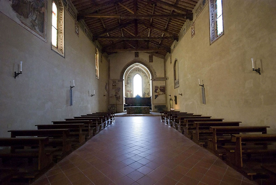La Chiesa, del XIV sec., riprende lo stile semplice delle chiese francescane. Conserva diversi affreschi trecenteschi raffiguranti la vita di San Francesco, attribuiti alla scuola senese. Fu restaurata nel 2002 e vi è stato inserito un altare formato da tre blocchi grezzi di travertino provenienti dalle cave della vicina Serre di Rapolano, opera dello scultore contemporaneo Massimo Lippi. Da segnalare anche un presepe in ceramica realizzato nel 1989 dal ceramista pientino Piero Sbarluzzi.