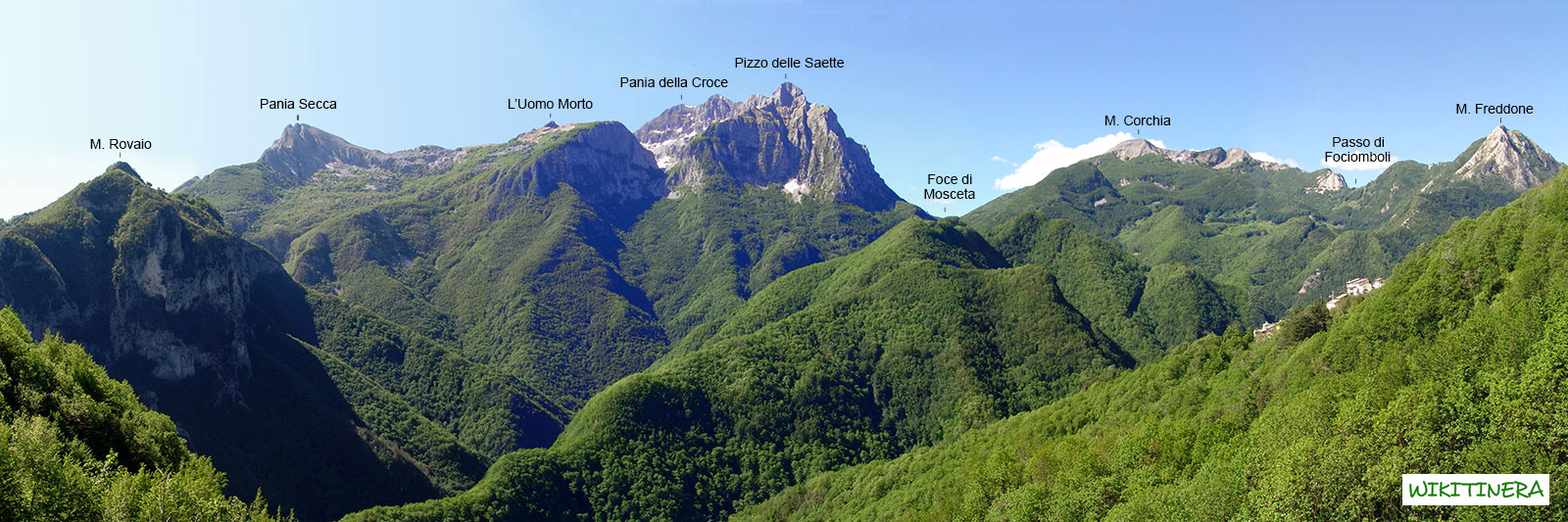Il Gruppo delle Panie domina la valle della Tùrrite Secca. In evidenza la Pania Secca e il Pizzo delle Saette. Al centro si intravede il profilo dell’Uomo Morto e alla sua destra la cima della Pania della Croce. Tra L’Uomo Morto e la Pania Secca si trova la Vetricia, l’altopiano carsico più esteso delle Apuane. Più a destra il crinale scende alla Foce di Mosceta per poi risalire sul Monte Corchia. Sotto il Monte Corchia si apre l’alpeggio del Puntato, area storicamente dedita alle attività pastorali.