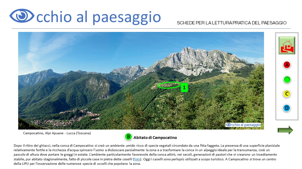 Dopo il ritiro dei ghiacci, nella conca di Campocatino si creò un ambiente umido ricco di specie vegetali circondato da una fitta faggeta. La presenza di una superficie planiziale relativamente fertile e la ricchezza d’acqua spinsero l’uomo a disboscare parzialmente la zona e a trasformare la conca in un alpeggio ideale per la transumanza, cioè un pascolo di altura dove portare le greggi in estate. L’ambiente particolarmente favorevole della conca attirò, nei secoli, generazioni di pastori che vi crearono un insediamento stabile, pur abitato stagionalmente, fatto di piccole case in pietra dette caselli (1). Oggi i caselli sono perlopiù utilizzati a scopo turistico. A Campocatino si trova un centro della LIPU per l’osservazione delle numerose specie di uccelli che popolano la zona.