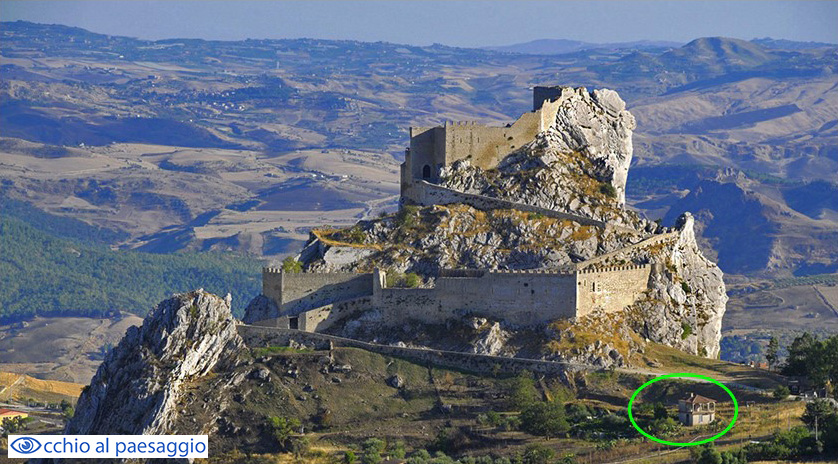 Edificio costruito negli anni ’70 del secolo scorso accant alla massicciata che conduce al castello. La costruzione fu realizzata senza permessi ma venne poi sanata e regolarmente accatastata anche se in realtà non venne mai completata e, di conseguenza, mai abitata. Ritenendo che la sua posizione proprio di fronte al castello deturpasse la vista dell’antico fortilizio, un imprenditore agricolo in pensione di Mussomeli, Sebastiano Misuraca, lo acquistò con il solo intento di farlo abbattere, cosa che di fatto avvenne nel 1° dicembre 2020. Alla stampa che chiedeva del perché abbia voluto abbattere l’edificio, Sebastiano Misuraca rispose: “Erano quarant’anni che quella costruzione mi stava sullo stomaco ma la goccia che ha fatto traboccare il vaso è caduta una mattina che mi trovavo con i miei nipoti nel piazzale del castello. Sono arrivati dei pullman con a bordo turisti tedeschi e appena scesi hanno guardato con orrore quel caseggiato, e si sono messi le mani nei capelli. M’è scattato dentro come una molla. Ho quindi contattato i proprietari e ci siamo messi d’accordo, col pieno avallo del sindaco Catania (….). In mezza giornata (….), l’ho fatta demolire.”