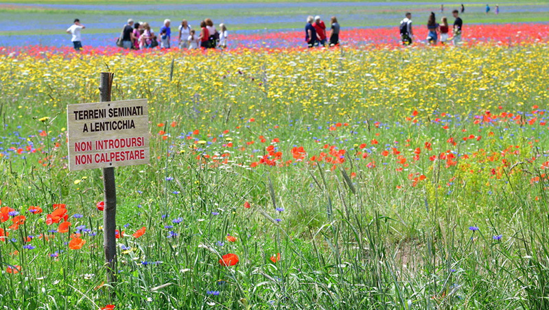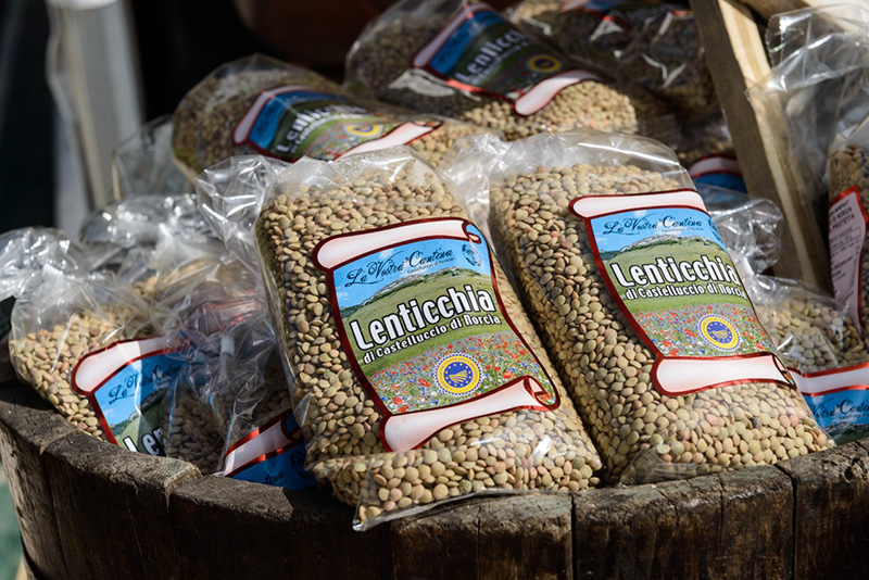 Nella pianura antistante il borgo di Castelluccio, nota come Pian Grande, si coltiva da sempre una varietà di lenticchia (Lens culinaris) oggi nota come Lenticchia di Castelluccio di Norcia, marchio IGP dal 1977. Secondo alcuni ritrovamenti archeologici la coltivazione della lenticchia nella zona risalirebbe addirittura all’epoca pre-romana divenendo nei secoli parte integrante della tradizione agricola e culinaria locale.  A favorire il successo di questa varietà è stata la concomitanza di una serie fattori che caratterizzano il Pian Grande. Tra questi, il clima invernale particolarmente rigido, un suolo ben drenato e l’adozione di pratiche agricole tradizionali sono all’origine delle caratteristiche della Lenticchia di Castelluccio e della sua unicità sia dal punto di vista sia agronomico (foto) che nutrizionale (foto).
