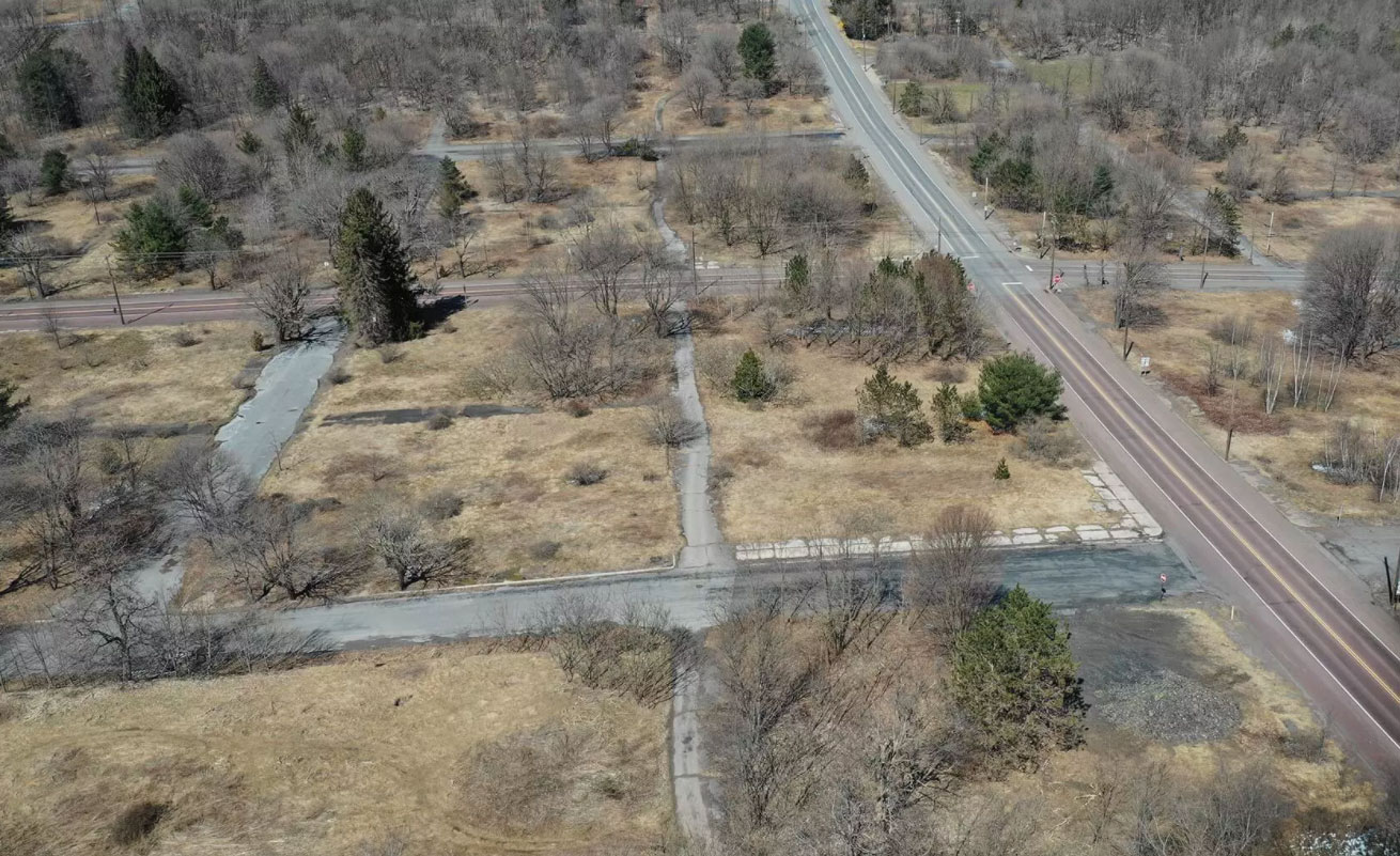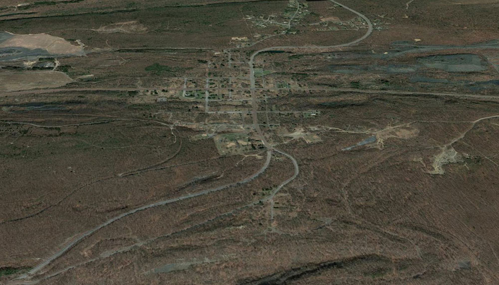 Veduta aerea di ciò che resta del paese di Centralia (foto da Google). Qui sotto: oggi di quello che un tempo fu il centro del paese non resta che il reticolo stradale tra depositi di carbone e zone disabitate che stanno tornando gradualmente allo stato naturale (foto Fabio Di Bitonto).