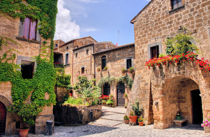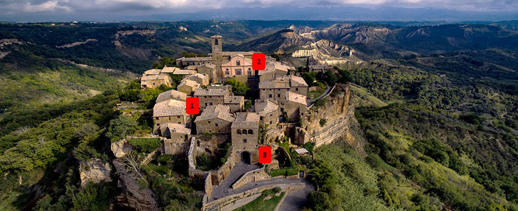 Il borgo fu fondato dagli Etruschi nel III sec. a.C. lungo un’importante via di comunicazione che collegava il territorio del Lago di Bolsena con la Valle del Tevere, e con Vulsinium (Orvieto) in particolare. All’epoca, l’Antica Civitas era il centro della vita sociale, politica e religiosa mentre dove ora sorge l’attuale Bagnoregio vi era solo un abitato periferico minore chiamato Rota. In epoca medievale i due nuclei abitativi, Civita e Rota, furono collegati da un ponte e nel XII sec. e diventarono parte di un unico borgo chiamato Bagnorea il cui centro si sviluppò proprio tra i due nuclei originari. In seguito Civita acquisì nuovamente potere fino a quando le condizioni di instabilità del terreno su cui è sorta giunsero al punto di decretarne il pressoché totale abbandono. Civita è ancora un borgo sostanzialmente medievale (1) ma presenta anche architetture rinascimentali come la facciata della Chiesa di San Donato (2), originariamente in stile romanico. L’accesso al borgo avviene da Porta di Santa Maria, l’unica rimasta di quelle esistenti in passato (3). Tra le più importanti testimonianze di epoca etrusca vi è una necropoli e la tomba etrusca, a Bagnoregio, conosciuta nella tradizione popolare come la Grotta di San Bonaventura (4). (foto M.Zanardi)