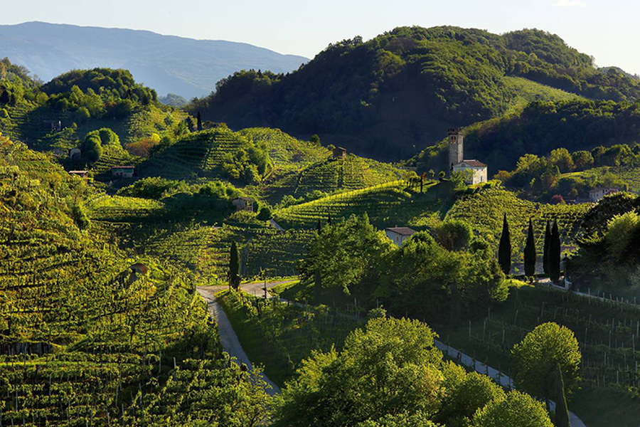 Le Colline del Prosecco di Conegliano e Valdobbiadene sono la zona di produzione dell’omonimo vino bianco divenuto DOCG nel 2009. Storicamente però, il vino è originario dei dintorni di Trieste, dove veniva prodotto fin dal Medio Evo col nome popolare di ribolla, cambiato poi in prosecco alla fine del XVI sec. per identificarne il territorio di produzione che era appunto in prossimità della Torre di Prosecco, nell’omonima località triestina. Il Prosecco Conegliano Valdobbiadene, prodotto quasi esclusivamente con uve Glera (minimo 85%), ha avuto un forte successo di mercato soprattutto a partire dal 2005, e nel 2018 ha toccato la vendita record di 91 milioni di bottiglie contro i 30 milioni del 2003. La crescita produttiva è seguita a un aumento esponenziale della superficie vitata che solo dal 2011 al 2018 ha registrato un incremento del 40%, passando rispettivamente da 5.754 ettari a 8.088 ettari. Questo deciso cambio di passo è stato possibile grazie alla sostituzione delle pratiche vitivinicole tradizionali (foto) con una sempre maggior diffusione della coltivazione intensiva (foto).