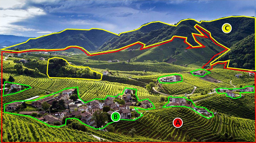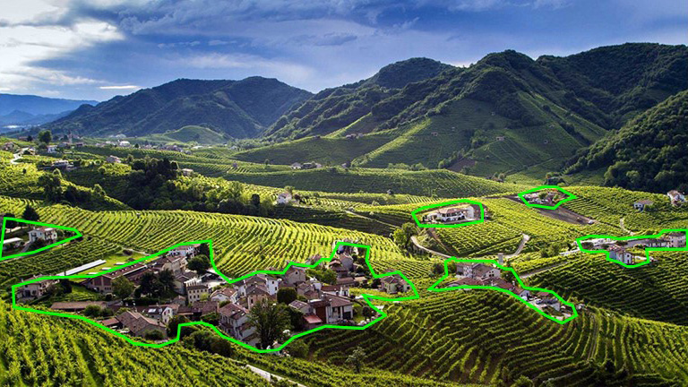 Gli insediamenti abitativi nelle Colline del prosecco sono formati da piccoli centri rurali e abitazioni isolate, sparse tra i vigneti. Questo scenario ricalca quello che doveva essere l’impianto storico del territorio con la sola notevole eccezione del rapporto tra la superficie edificata e quella occupata dai vigneti. Il recente forte aumento delle aree coltivate ha di fatto alterato il rapporto spaziale che storicamente doveva sussistere tra le fattorie e i vigneti di pertinenza, quando questi erano coltivati con pratiche agricole con esigenze produttive minori degli attuali a coltivazione intensiva. La combinazione tra l’agricoltura intensiva, con ciò che comporta in termini di inquinamento da pesticidi e erbicidi, e l’alta concentrazione di vigneti in prossimità delle abitazioni, è all’origine di un forte conflitto tra la popolazione locale e molti produttori di prosecco (foto).