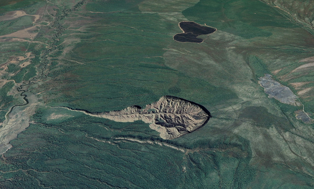 Il Cratere di Batagaika disegna una figura bizzarra nella taiga siberiana (foto da Google Earth). Sotto: la voragine si apre improvvisamente nella pianura tra i boschi della taiga (foto s-vfu.ru).