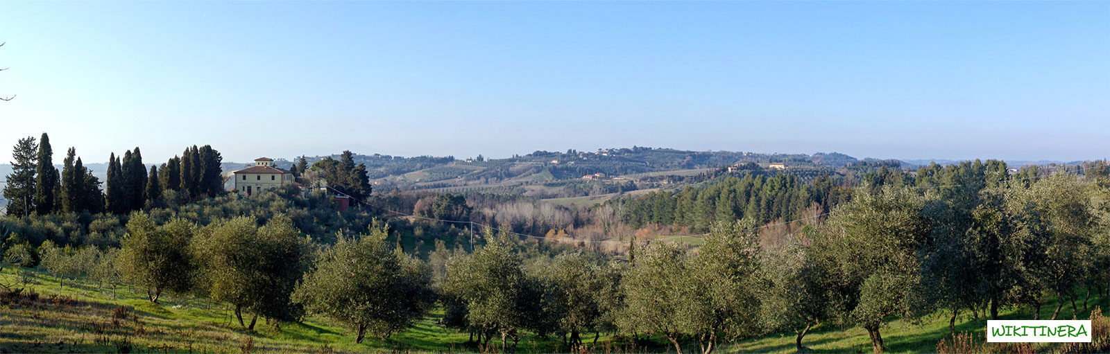 Il paesaggio offre uno scorcio di sapore antico in cui gli insediamenti mantengono una condizione rurale, con casolari isolati nelle tenute agricole di pertinenza, a loro volta inframezzate a piccole aree boschive, residuo dell’antica copertura arborea. Il casale in stile leopoldino e l’annesso filare di cipressi sono il riferimento dell’oliveto bordato dal bosco, secondo uno schema che si ripete in lontananza come un modello al tempo stesso antico e sostenibile di utilizzo del suolo.