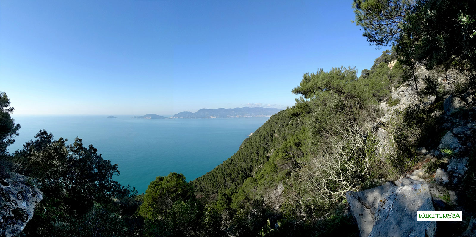 Quando il sentiero n° 444 esce dalla macchia per attraversare una pietraia, la vista si apre nuovamente sul Golfo dei Poeti.