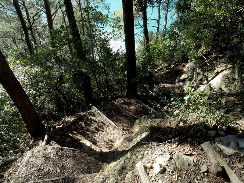 Il sentiero n° 436 scende vrteiginosamente verso la spiaggia di Punta Corvo.