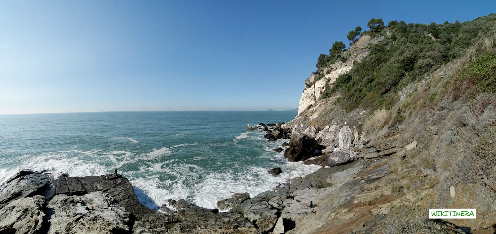 Punta Bianca, all’estremità meridionale del Promontorio di Montemarcello,  deve il suo nome al fatto di essere formata da uno strato di roccia bianca che la rende inconfondibile. Punta Bianca non ha spiaggia ma la scogliera digrada dolcemente consentendo di scendere in mare ma solo se  perfettamente calmo.