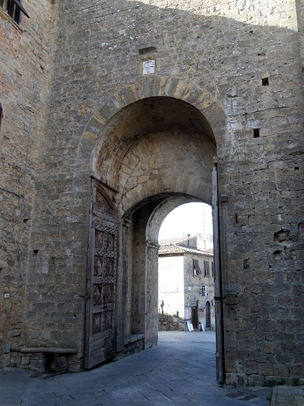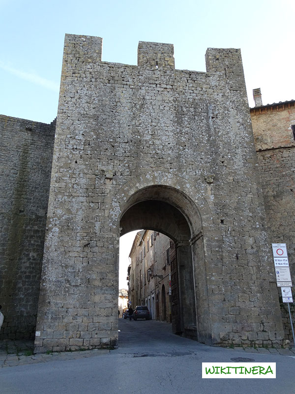 Detta anche Porta Pisana perché immetteva nella strada che conduceva a Pisa, risale al XIII sec. Lo storico Corrado Ricco la definì la porta … più grandiosa di Volterra, ed è tuttora uno degli accessi principali al borgo medievale, l’unica a presentare ancora tracce degli affreschi che decoravano la parte interna di tutte la porte della città. Sulle pareti interne è scolpita la canna pisana, unità di misura di poco più lunga della canna volterrana che si trova sulla facciata del Palazzo dei Priori.