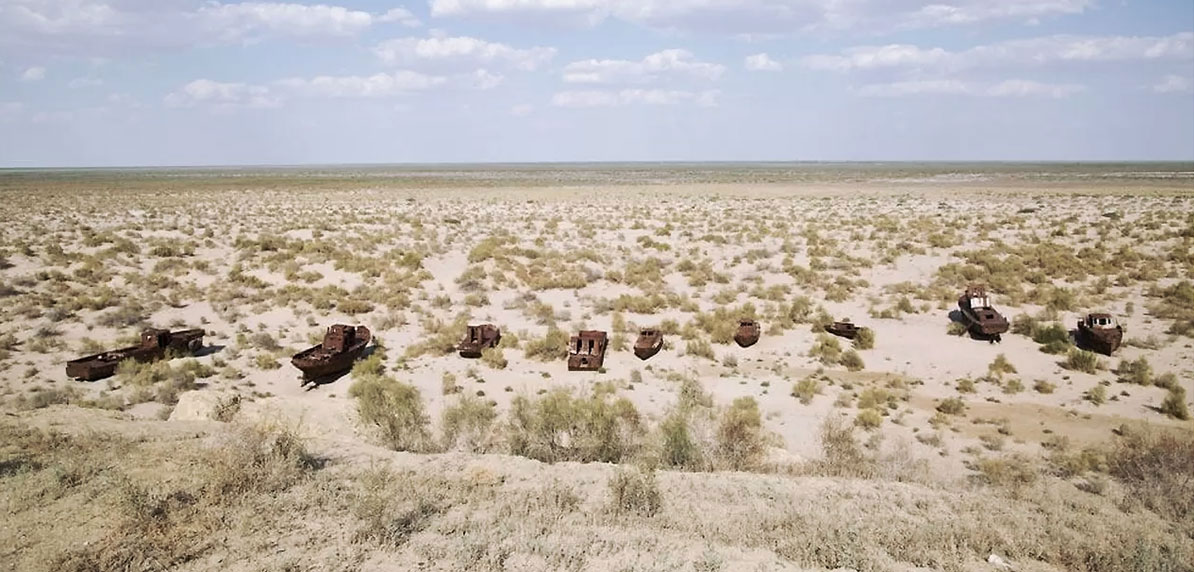 Una piccola flotta di barche ormai ridotte a carcasse arrugginite giacciono abbandonate in secca al margine del deserto di Aralkhum che si perde all’orizzonte.