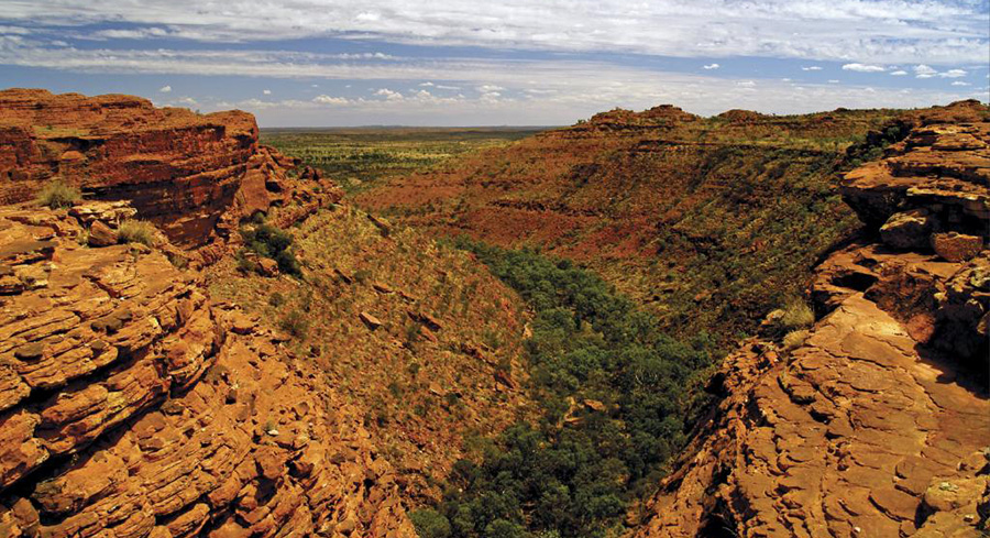 Un canyon inciso nelle formazioni rocciose sfocia nella pianura del deserto australiano.