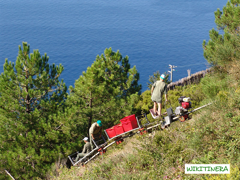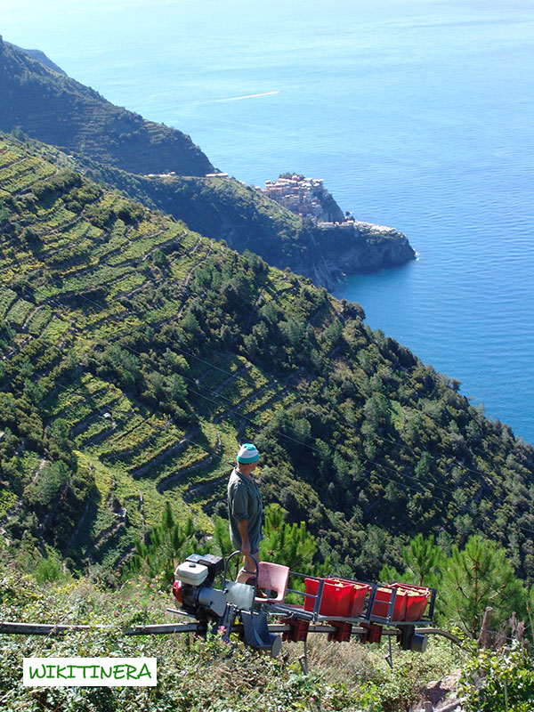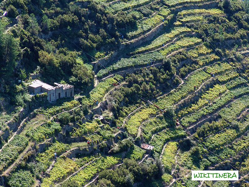 E’ uno dei paesaggi più suggestivi delle 5 Terre. Il versante è modellato dai terrazzamenti per la coltivazione della vite. Le fasce si spingono fin nelle parti basse del pendio dove i muretti a secco si intravedono nel bosco che ha invaso i coltivi abbandonati. Il versante intorno di Corniglia è la zona più produttiva delle 5 Terre. Per ovviare al pendio molto ripido tra i vigneti sono stati installati dei trenini a cremagliera in grado di trasportare carichi pesanti anche su forti pendenze.