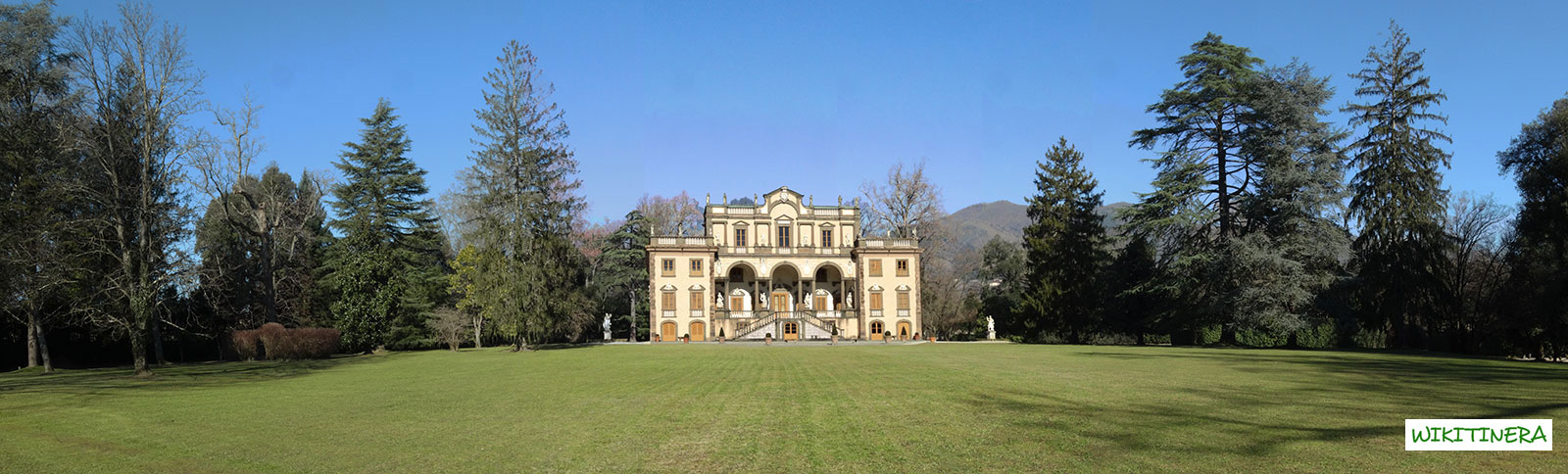 Fu costruita nel XVI sec. ma l’edificio attuale è il frutto di importanti modifiche apportate dai proprietari che si avvicendarono nel corso dei secoli. L’elemento che più la caratterizza è la facciata monumentale, frutto di un restauro seicentesco dell’edificio originario e di un successivo intervento nel ‘700 che le conferì l’aspetto teatrale attuale. L’originario giardino seicentesco fu trasformato prima nel tipico giardino barocco all’italiana, e poi, nell’800 nell’attuale giardino all’inglese.
