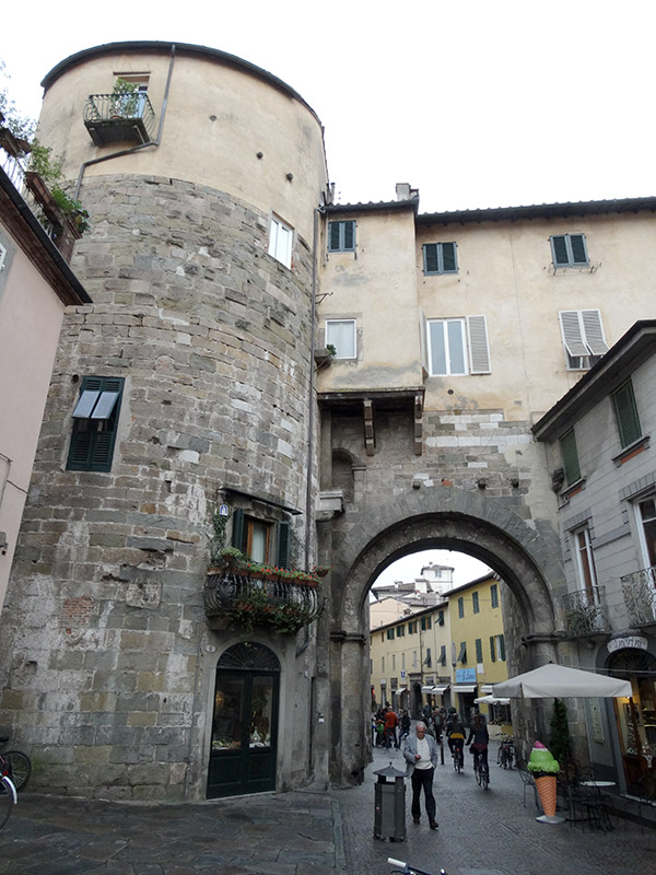 Presenta un’unica apertura con arco a tutto sesto a lato di un torrione laterale inglobato in costruzioni più recenti. La parete interna dell’arco è decorata con un affresco raffigurante una Madonna con Bambino. Sebbene inglobata nel tessuto urbano recente per la scomparsa delle mura duecentesche, la porta mantiene tuttora un chiaro rapporto con il contesto originario permettendo l’accesso all’antico borgo attraverso Via Fillungo, una delle più importanti vie della cittadina medievale.