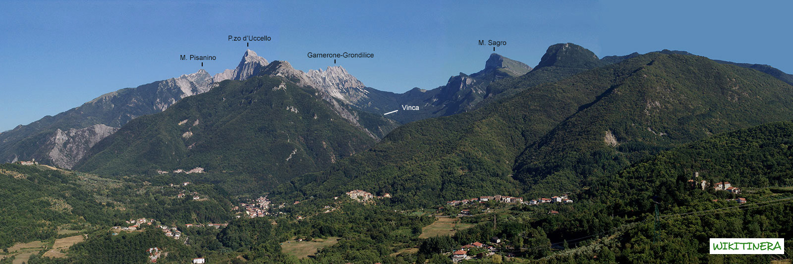 Il versante lunigianese delle Alpi Apuane con al centro la valle di Vinca, tra il Monte Sagro e il Monte Grondilice. Il paesaggio mostra il duplice carattere di questa parte di Lunigiana: un ambiente alpestre con cime rocciose e pendici coperte da fitti boschi incombe su un ambiente collinare di tipo rurale in cui piccoli insediamenti sorgono tra aree prative e zone ancora boscate. Il limite tra i due ambienti appare netto e coincide chiaramente con il cambiamento dell’inclinazione dei versanti.