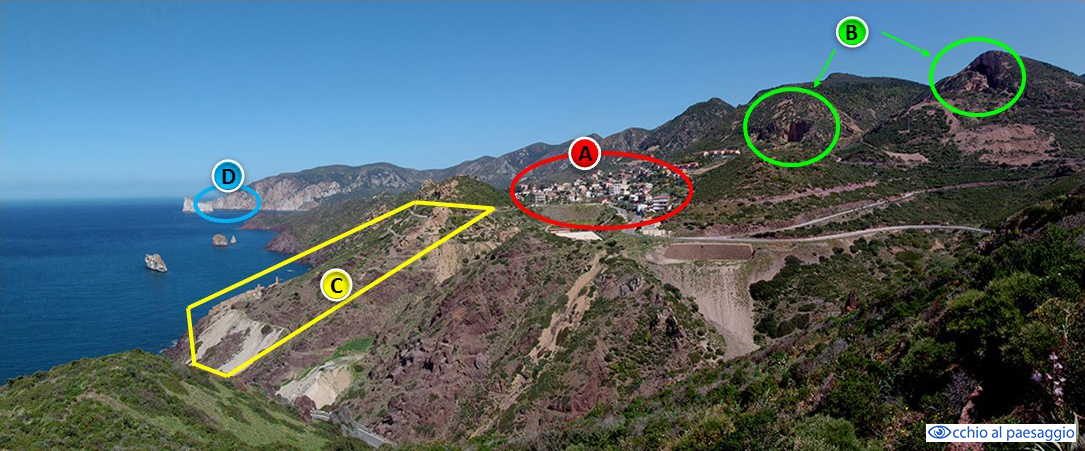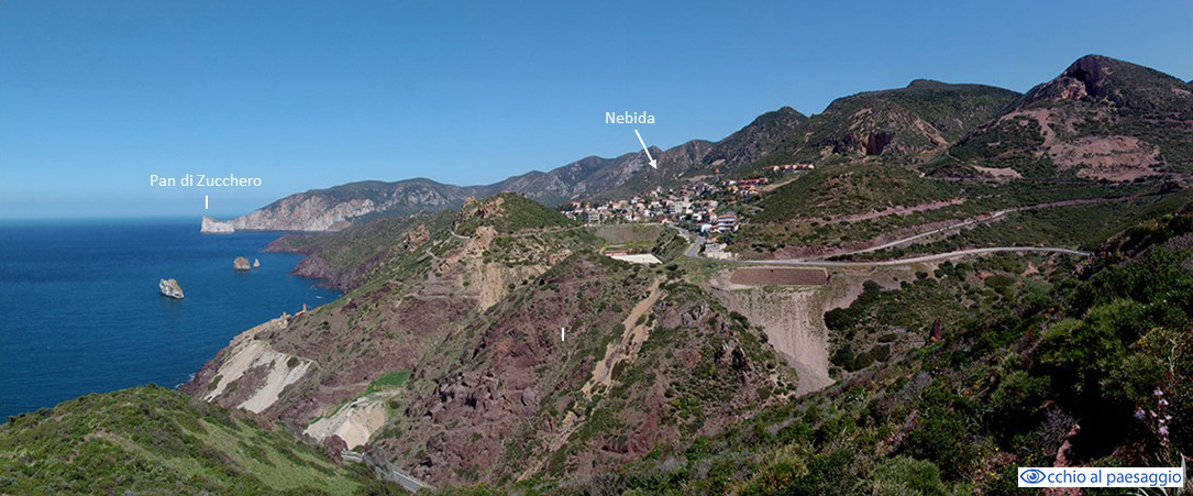 La costa di Nebida presenta forme e colori che la rendono un luogo assolutamente unico. Le pendici di roccia viola scuro, appena ricoperte da una scarna macchia mediterranea, fanno da cornice al paese di Nebida e creano un vivace contrasto cromatico con il blu del mare e i faraglioni bianchi antistanti la linea costiera. Sullo sfondo si erge la falesia che fa capo a un caratteristico isolotto dalle pareti verticali, chiamato Pan di Zucchero.