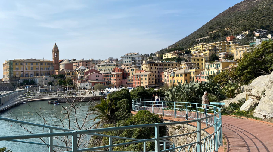 Vista della Baia di Nervi, storica insenatura delimitata a nord dalla spiaggia, ad oggi luogo adibito al turismo e all’attraccaggio di barche da pesca e barche a vela. Coronano la baia, insieme ai coloratissimi edifici tipici della riviera ligure, il molo e la splendida passeggiata che percorre il litorale.
