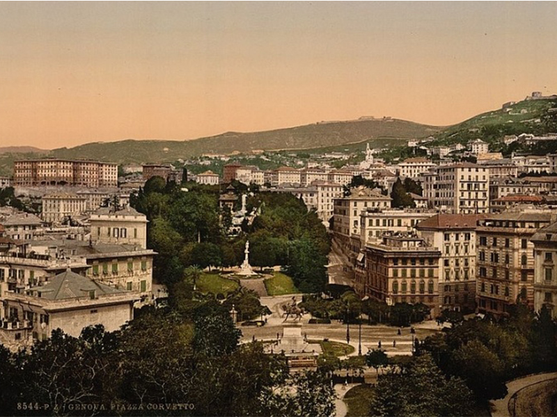 La piazza si colloca in quello che era il quartiere popolare di Portoria, interessato dal piano urbanistico di Carlo Barabino (foto). Il primo intervento del 1870 realizza via Roma e Piazza Corvetto aprendo un collegamento tra il centro cittadino e i nuovi quartieri residenziali altoborghesi di Castelletto (foto). Il rinnovamento urbano era motivato dall'esigenza di provvedere alla sistemazione degli ormai antichi e insufficienti assi viari della città (foto). Convergono qui infatti la circonvallazione a monte, le gallerie in direzione delle "strade nuove" e le principali arterie del capoluogo, tra cui: Via Assarotti, Via Roma, Via Palestro. Oggi la piazza è uno dei cuori pulsanti del centro storico genovese; qui passavano le prime linee di tramway elettrici, inaugurata nel 1893. Ad oggi sotto la piazza passa la metropolitana che collega Brin alla stazione Brignole.