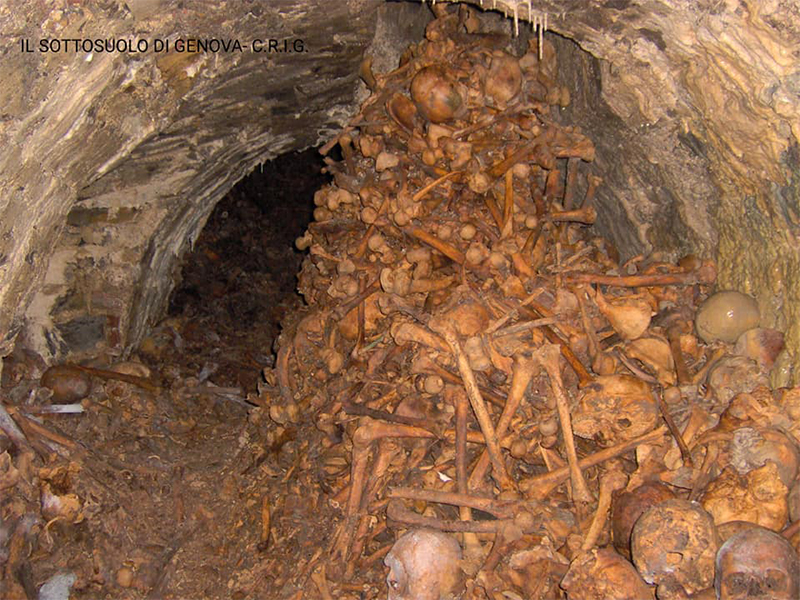 Nel 1987 venne scoperta sotto Piazza Corvetto e il Parco dell’Acquasola una grotta artificiale, parte del complesso delle catacombe dei morti di peste del ‘600. (foto) La scoperta è attribuibile a un gruppo di speleologi del "Centro Studi Sotterranei" capitanati da Roberto Bixio. Durante l'epidemia del 1656-57 morirono circa 70.000 genovesi che vennero sepolti nei sotterranei del centro cittadino. Le catacombe, situate a una profondità di 12 metri circa, sono strutturate in gallerie alte due metri con nicchie dove probabilmente i soldati durante la seconda guerra mondiale (quando il sito veniva utilizzato come bunker) deponevano munizioni e viveri.