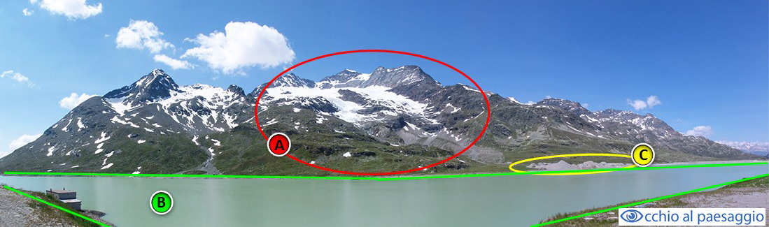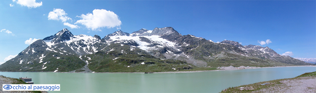 Il Piz Cambrena, una delle vette principali del Massiccio del Bernina, si staglia sullo sfondo del Lago Bianco che occupa gran parte del crinale del Passo del Bernina. Al centro del versante montuoso si riconoscono le lingue del Ghiacciaio Cambrena protendere verso il fondovalle.