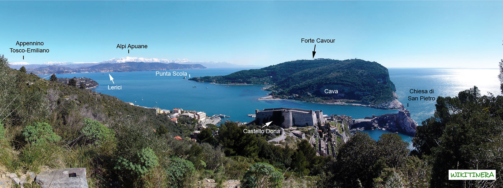 Uno dei panorami più belli del Golfo dei Poeti dominato dal Castello di Portovenere e dall’Isola Palmaria. Portovenere e l’Isola Palmaria sono accomunati da un percorso storico incentrato su due fattori: la posizione strategica per il controllo militare dei collegamenti marittimi con La Spezia, e la ricchezza mineraria del sottosuolo. Oggi ad accomunare i due luoghi è invece lo sviluppo turistico a cui si associa l’allevamento di mitili, che qui trovano condizioni di crescita ideali.