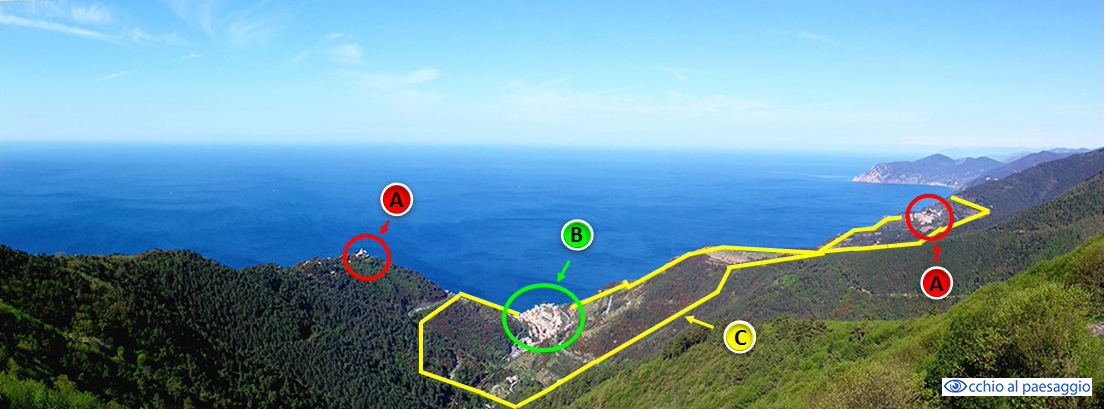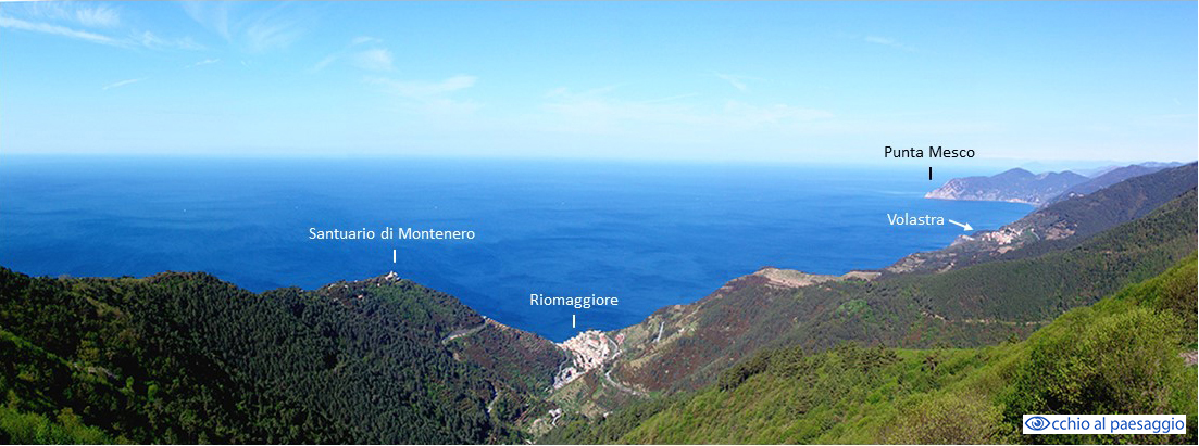 Una vista insolita del territorio delle 5 Terre che mette in risalto la parte alta del versante costiero, coperta da fitti boschi, in prevalenza di pino marittimo. Al centro della scena il borgo di Riomaggiore si affaccia sul mare, circondato dai tipici terrazzamenti che giungono fino a toccare Il Santuario della Madonna di Montenero, alla sua destra e il paese di Volastra alla sua sinistra. Sullo sfondo si distingue l’inconfondibile profilo di Punta Mesco.
