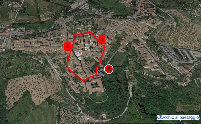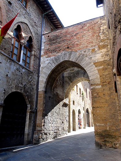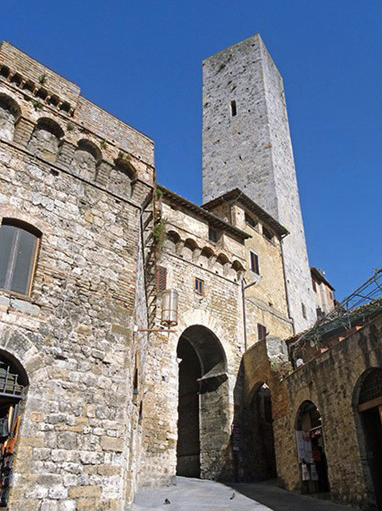 Agli albori della sua storia San Gimignano aveva un’estensione molto minore del borgo attuale, come indicano le tracce delle mura che la cingevano tra il X e il XII sec. Oggi questa cerchia muraria è in buona parte scomparsa, inglobata nel tessuto urbano per il progressivo ampliarsi del tessuto urbano oltre i suoi confini originari. Sono però ancora ben visibili quelle che erano le sue due porte principali: l’Arco della Cancelleria (1) e l’Arco dei Becci (2), che si aprivano rispettivamente sul lato settentrionale e meridionale delle antiche mura, e che consentono tuttora l’accesso alla parte più centrale della cittadina. Questa costituisce di fatto il nucleo storico del borgo attuale, seppur le costruzioni al suo interno siano per gran parte successive al XII  sec.