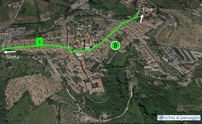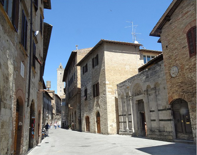 L’antico nucleo di San Gimignano sorse lungo la Via Francigena, che collegava Canterbury a Roma fin dall’alto Medio Evo. A partire dal XI-XII sec. la crescita economica generata dal traffico di merci e persone favorì la costruzione di strutture abitative e commerciali al di fuori della cinta muraria originaria portando il borgo a estendersi lungo il tracciato dalla Via sia verso Siena che verso Pisa. Due lunghi tratti della Via furono così inglobati nel tessuto urbano divenendo le principali vie del borgo (1). Quando l’Arcivescovo di Canterbury Sigerico passò per San Gimignano alla volta di Roma, nel X secolo, queste erano ancora aperta campagna.