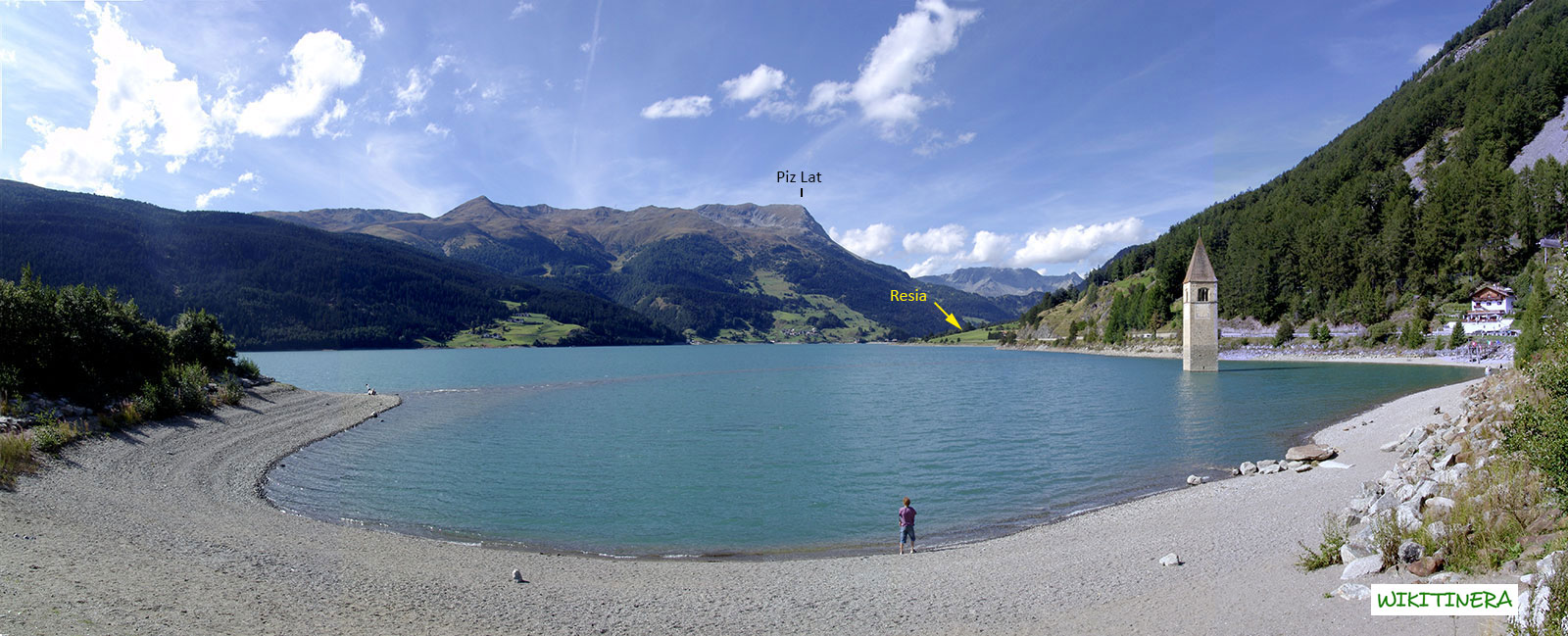 Dalle acque del Lago di Resia emerge il campanile dell’originario borgo di Curon, sommerso dal bacino artificiale creato nel 1950 dall’unione di due laghi naturali. Il borgo fu poi ricostruito sulle rive del lago. Sullo sfondo si trova l’abitato di Resia, non visibile nel panorama, che prelude all’omonimo Passo che porta in Austria. Il Piz Lat segna invece il confine tra Italia e Svizzera, e oltre il suo crinale inizia l’Engadina.